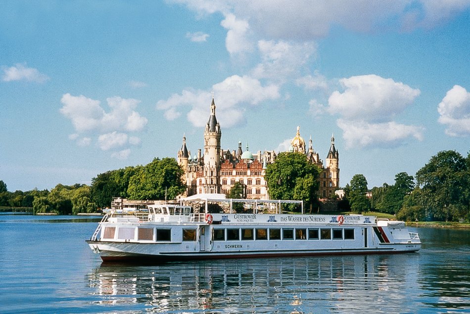 Hier starten Sie zur 4-Seen-Schifffahrt mit der "Weißen Flotte". Die Rundfahrt startet auf dem Schweriner Innensee, vorbei am Schweriner Schloss, welches oftmals als "Neuschwanstein des Nordens" bezeichnet wird. Durch kleine Kanäle geht es weiter über den Heidensee in den Ziegelaussensee und den Ziegelinnensee. Lassen Sie sich von der Aussicht auf hübsche Sommerhäuschen und die malerischen Uferlandschaften mit seinen schilfbewachsenen Buchten verzaubern. Die Landeshauptstadt ist mit ihren Seen so wassernah gelegen, dass diese Schifffahrt fast schon einer Fahrt durch historische Gassen gleicht.