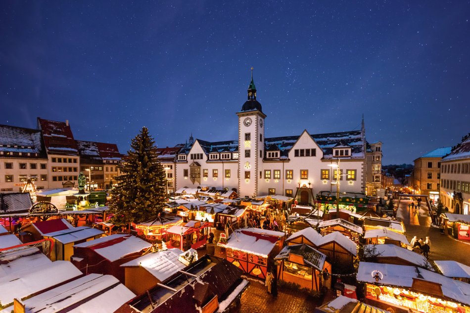 Während der Anreise ins Erzgebirge legen Sie einen Stopp in der "Silberstadt" Freiberg ein. Lassen Sie sich von den über 90 liebevoll bergmännisch gestalteten Hütten, Bergmann und Engel, typischen Figuren aus dem Bergbau verzaubern, die an vielen Ecken die Besucher grüßen. Echte Handwerkskunst, wie Räuchermännchen, Schwibbögen oder Figuren aus Freiberger Zinn sind an vielen Ständen erhältlich. Am Abend werden Sie im 26. Stock des Hotels zum Abendessen mit einer atemberaubenden Aussicht erwartet.