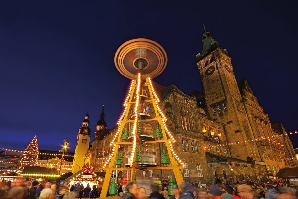 Nach dem Frühstück treten Sie die Heimreise an. Bei einem Stopp in Chemnitz können Sie den dortigen Weihnachtsmarkt erkunden. Sehenswert ist hier unter anderem die 12 Meter hohe Weihnachtspyramide und der 5 x 2 Meter große Schwibbogen. Rechts und links davon stehen Engel und Bergmann, die ein beliebtes Fotomotiv der Weihnachtsmarktbesucher sind.